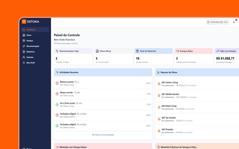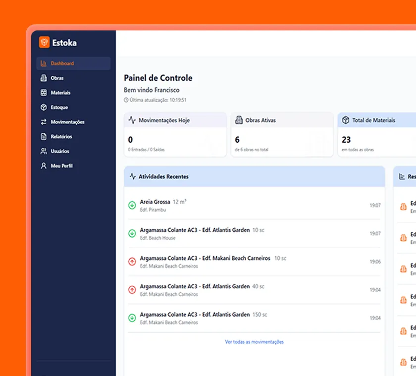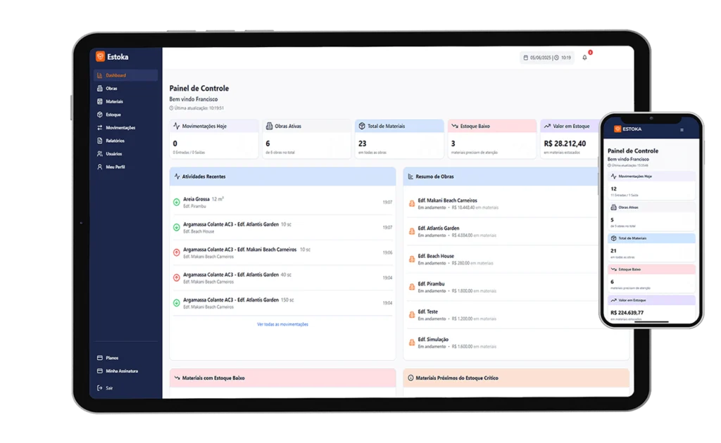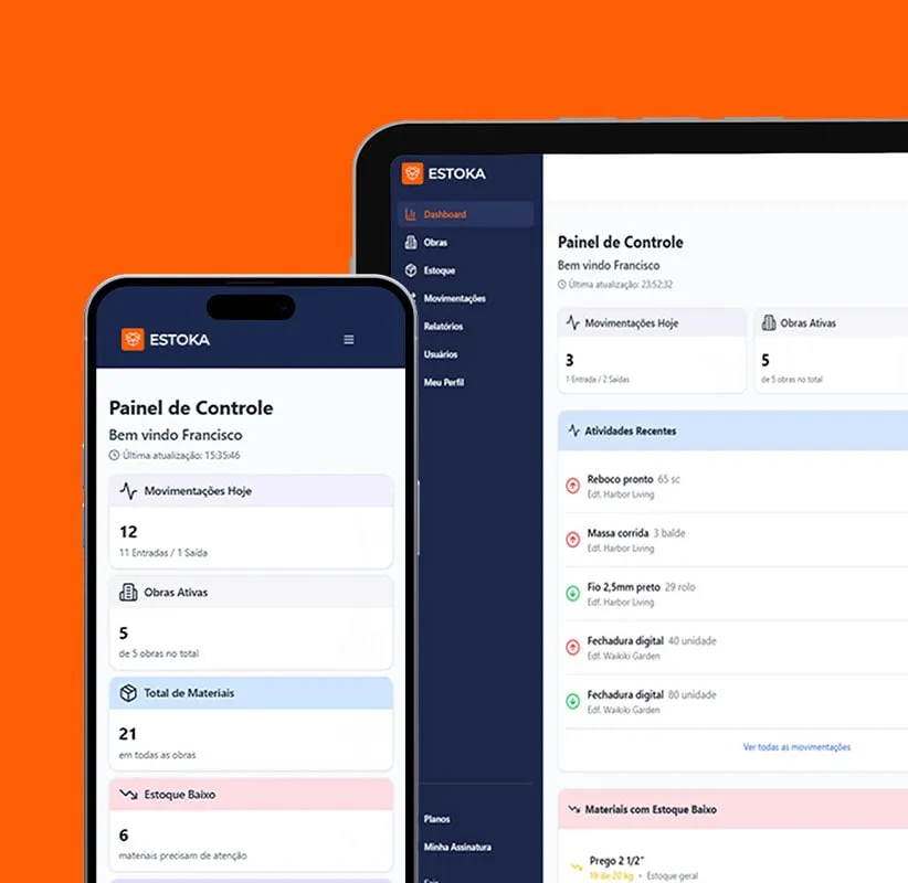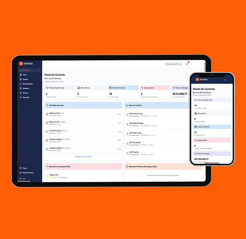 “Antes do ESTOKA, eu controlava tudo em planilha e WhatsApp… era um caos. Agora tenho o controle do estoque de cada obra no meu celular, em tempo real. Evitei duas compras duplicadas só no primeiro mês. O sistema se pagou rapidinho.”