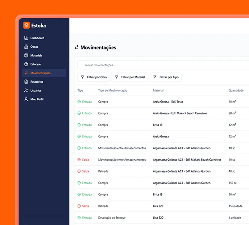 Tenha o registro de todas as movimentações de estoque e saiba tudo o que aconteceu na sua obra.